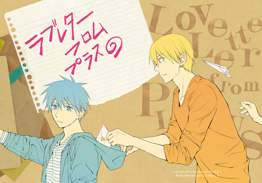 黒子っちの手が裏表紙側に回ってて紙飛行機を黄瀬君の頭にぶつけてる風なんですがわかりづらい。背景は素材に頼りきりです…。